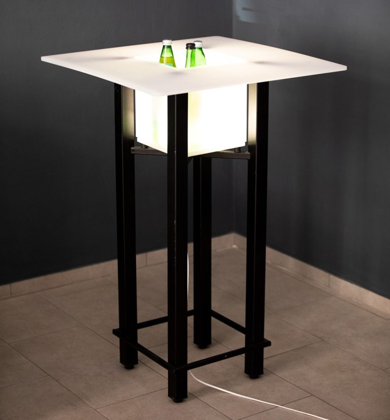 Ein kleiner Gartentisch aus pulverbeschichtetem Stahl, Edelstahl und Eternit, der sitzend und stehend verwendet werden kann.