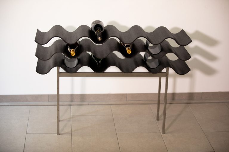 Das ist ein minimalistisches Weinregal aus Edelstahl und Faserzement, das in der Höhe und Länge beliebig ausbaubar ist.